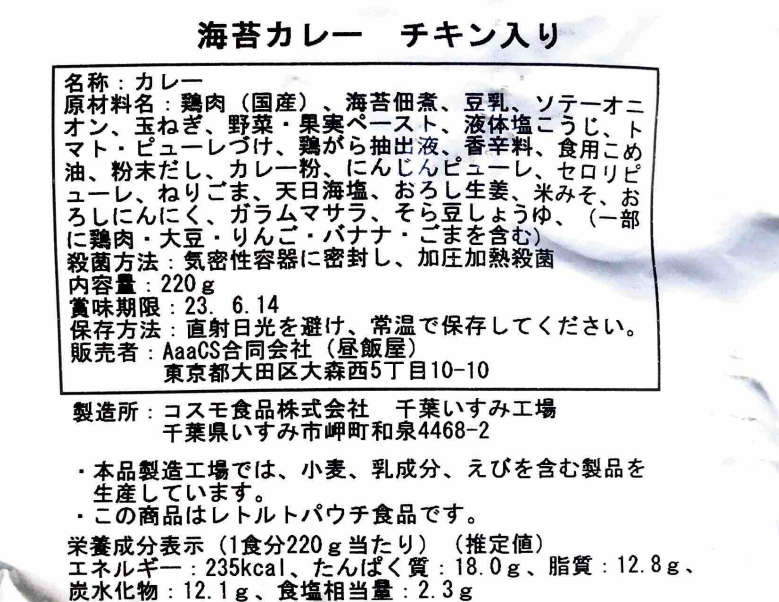 鶏肉(国産)、海苔佃煮、豆乳、ソテーオニオン、玉ねぎ、野菜・果実ペースト、液体塩こうじ、トマト加工品、チキンエキス(天然抽出)、香辛料、食用こめ油、粉末だし、カレー粉、にんじんピューレ、セロリピューレ、ねりごま、天日海塩、おろし生姜、米みそ、おろしにんにく、ガラムマサラ、そら豆しょうゆ、(一部に鶏肉・りんご・バナナ・ごま・大豆を含む)